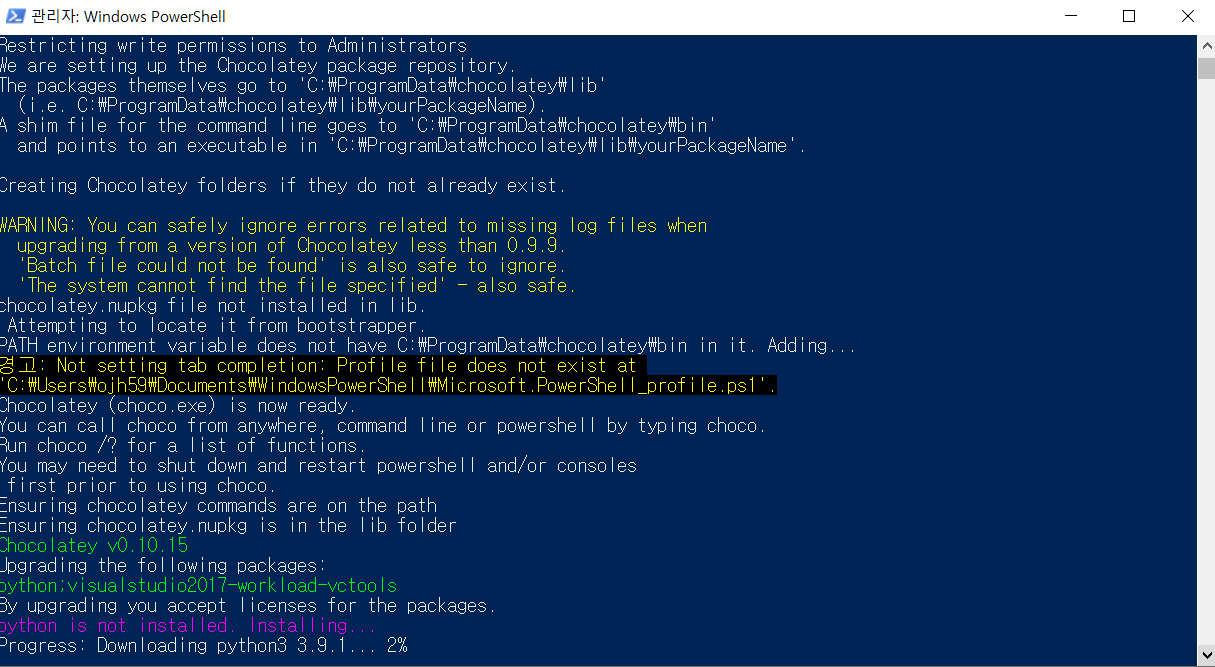 흠... 어찌저지 noed.js를 설치했다. 윈도우용 다운 받고 중간에 나온 체크박스를 체크하고 넘겼었는데 그거때문인지 아님 원래도 저렇게 powershell열어서 다운받는 건지 갑자기 저렇게 열리더니 막막 다운이 진행됐다. 잘 하고 있는 건지 모르겠다ㅠㅠ 오늘도 영어를 진짜 잘해야겠구나 새삼 느낀다... 다 영어....
